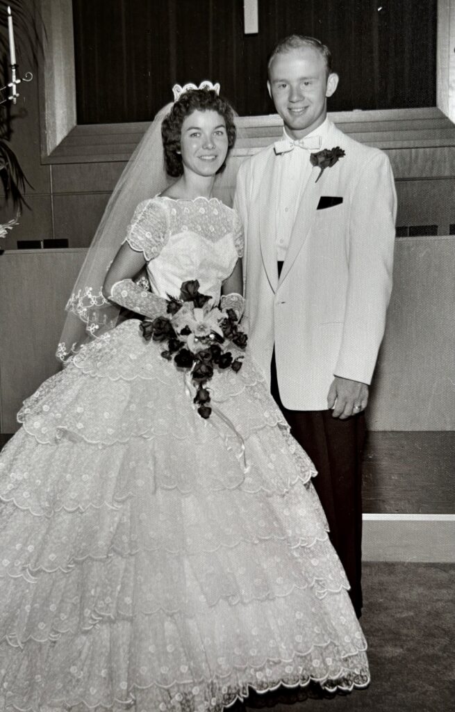 My parents met while in high school, mom a senior and dad a junior (my mom said when she first met my dad she didn’t care for him to much :) They double dated with friends but had never dated each other. After high school, mom attended college and got her teaching degree and dad worked in Oshkosh, New York and then enlisted in the Air Force. Mom had gotten engaged to one of my dad’s best friends, but dad had heard there were some problems and decided he would take a chance (since he had always had an interest in her) and sent mom a letter; that letter arrived for her the day after she had broken off her engagement. Mom and dad corresponded only through letters and fell in love without ever going out on a date. After a couple months, dad came home from Korea on leave took mom out to dinner and had an engagement ring waiting for her….they married on August 8, 1959.